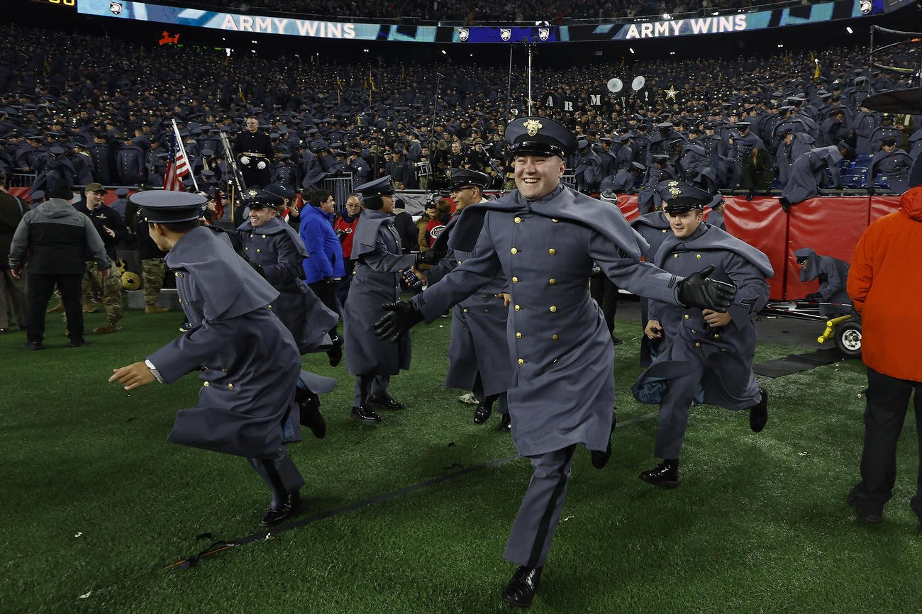 Nearly 100 buses carried students from West Point and Annapolis to Foxborough, where they took the field in their dress grays and blues in a pregame “march-on of the Brigade of Midshipmen and Corps of Cadets.” Ultramarathon relay teams ran game balls from their campuses, and parachute teams dropped onto the 50-yard line. New recruits were sworn in during a third-quarter timeout.